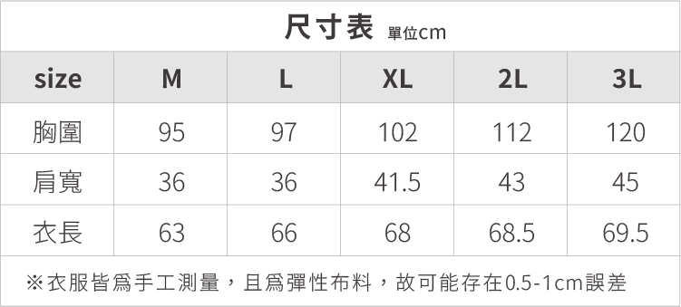 尺寸:M、L、XL、2L、3L (詳情請見下方圖片)